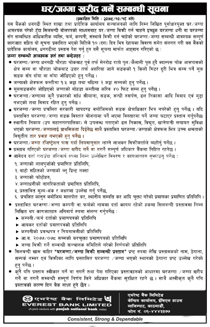 काठमाडौं । एभरेष्ट बैंक लिमिटेडले शाखा कार्यालय तथा प्रादेशिक कार्यालय संचालनका लागि जग्गा खरिद गर्ने भएको छ । बैंकले धनगढीस्थित शाखा तथा प्रादेशिक कार्यालय संचालनको लागि जग्गा खरिद गर्ने एक सुचना जारी गर्दै जनाएको छ ।