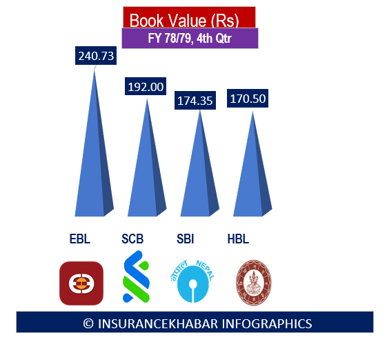 एभरेष्ट बैंकको सर्वाधिक २४० रुपैयाँ ७३ पैसा किताबी मूल्य हुँदा हिमालयन बैंकको सबै भन्दा कम १७० रुपैयाँ ५० पैसा किताबी मूल्य  छ।