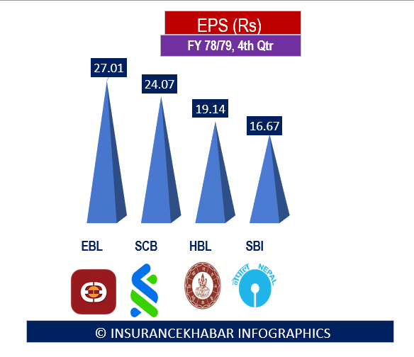 एभरेष्ट बैंकको सर्वाधिक २७ रुपैयाँ ०१ पैसा प्रति शेयर आम्दानी हुँदा नेपाल एसबिआई बैंकको सबै भन्दा कम १६ रुपैयाँ ६७ पैसा प्रति शेयर आम्दानी छ ।