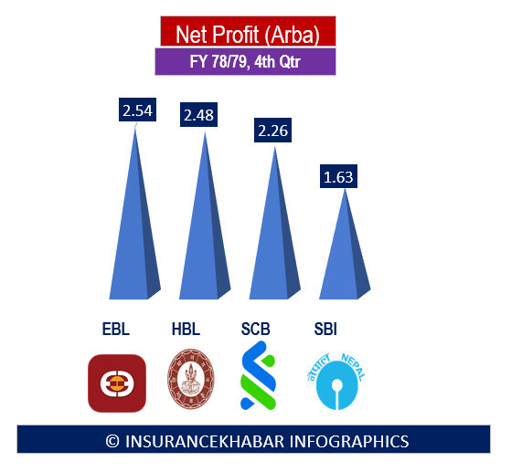 गत आवको १२ महिनासम्म एभरेष्ट बैंकले सर्वाधिक २ अर्ब ५४ करोड खुद नाफा गर्दा नेपाल एसबिआई बैंकले १ अर्ब ६३ करोड खुद नाफा गरेको छ ।