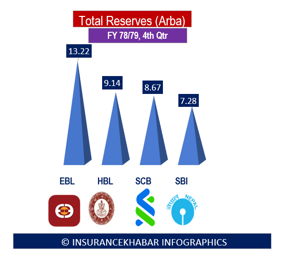 ४ वाणिज्य बैंक मध्ये एभरेष्ट बैंकको जगेडामा सबै भन्दा धेरै संचित छ । बैंकको जगेडामा १३ अर्ब २२ करोड रहेको छ भने नेपाल एसबिआईको जगेडामा सबै भन्दा कम ७ अर्ब २८ करोड रहेको छ।