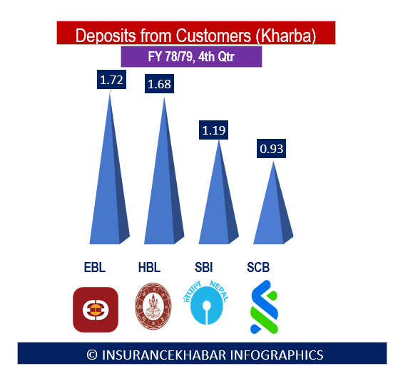 एभरेष्ट बैंकले सर्वाधिक १ खर्ब ७२ अर्ब निक्षेप संकलन गर्दा स्ट्याण्डर्ड चार्टर्ड बैंकले सबै भन्दा कम ९३ अर्ब निक्षेप संकलन गरेको छ ।