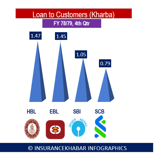 हिमालयन बैंकले सर्वाधिक १ खर्ब ४७ अर्ब कर्जा प्रवाह गर्दा स्ट्याण्डर्ड चार्टर्ड बैंकले सबै भन्दा कम ७९ अर्ब कर्जा प्रवाह गरेको छ ।खुद नाफाको आधारमा :