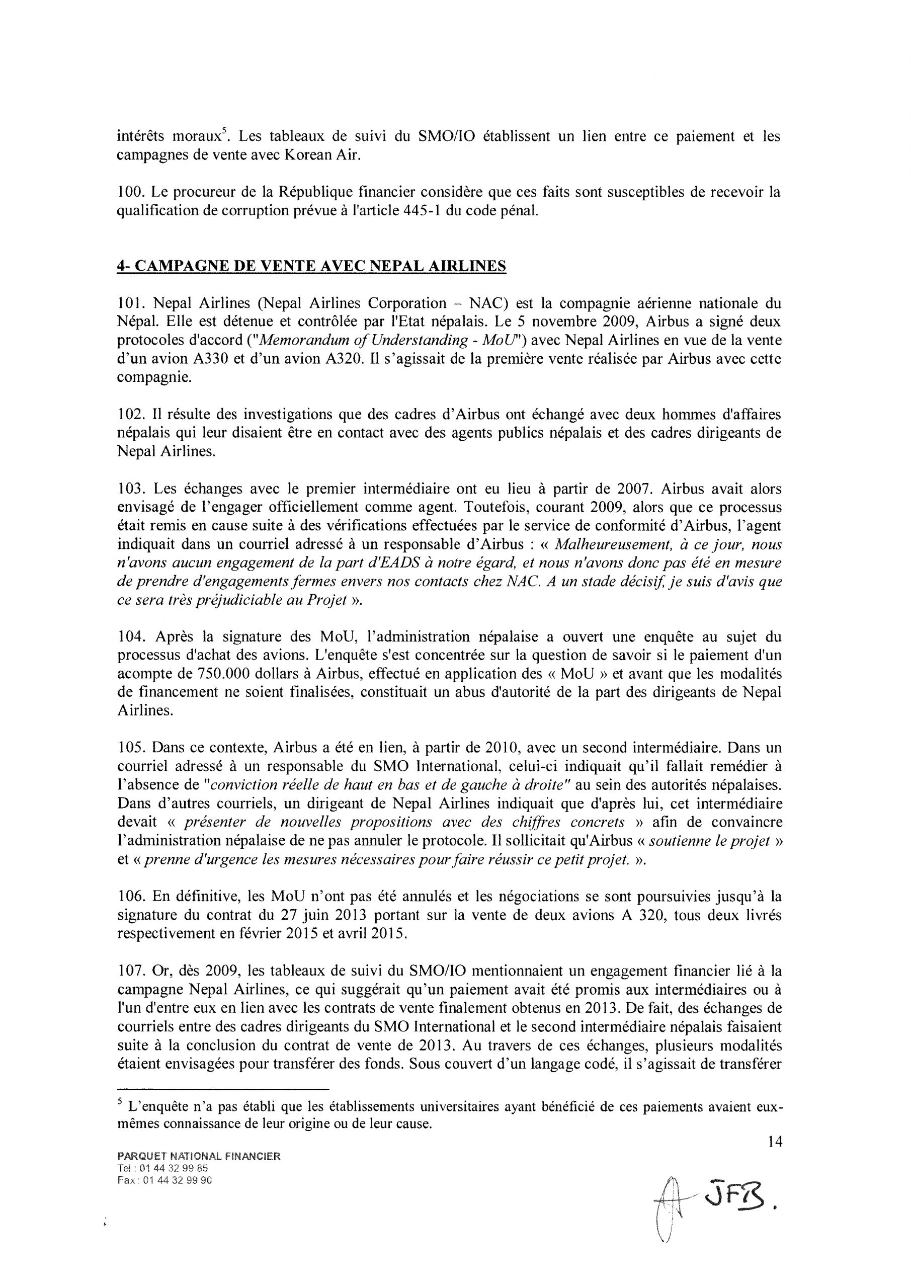 - However, from 2009, the SMO / 10 monitoring tables mentioned a financial commitment linked to the Nepal Airlines campaign, which suggested that a payment had been promised to the intermediaries or to Jun of them in connection with the contracts. finally obtained in 2013. In fact, e-mail exchanges between executives of SMO International and the second Nepalese intermediary followed the conclusion of the 2013 sales contract. Through these exchanges, several methods were envisaged for transferring funds. Under cover of a code language, it was a question of transferring