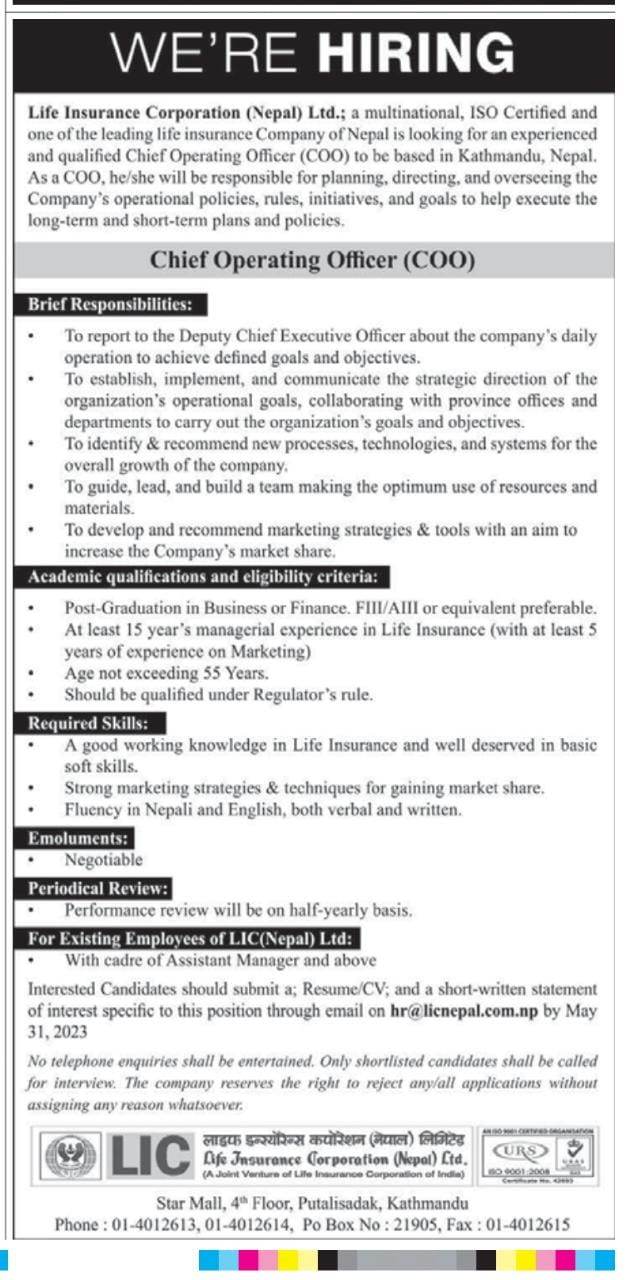 काठमाडौं । लाइफ इन्स्योरेन्स कर्पोरेशन नेपाल (एलआइसी) लिमिटेडले कर्मचारी माग गरेको छ । कम्पनीले चिफ अपरेटिङ अफिसरका लागि कर्मचारी माग गरेको हो । उक्त पदका लागि कम्पनीले बिजनेश तथा फाइनान्समा स्नातक तह उत्तीर्ण गरेको हुनुपर्ने जनाएको छ । साथै जीवन बीमा क्षेत्रमा १५ वर्षको अनुभव भएको हुनुपर्ने कम्पनीले बताएको छ । ईच्छुक तथा योग्यता पुगेका ब्यक्तिले आवश्यक काजगात संकलन गरी जेठ १७ गतेसम्म दरखास्त दिन सक्नेछन् ।