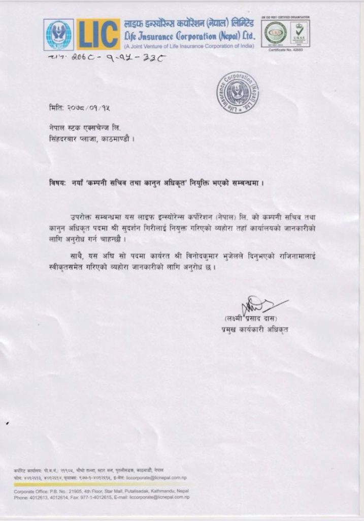 काठमाडौं । लाइफ इन्स्योरेन्स कर्पोशन (एलआईसी) नेपाल को कम्पनी सचिव तथा कानुन अधिकृत पदमा सुदर्शन गिरी नियुक्त भएका छन् ।साथै यस अघि उक्त पदमा कार्यरत विनोदकुमार भुजेलको राजिनामा स्वीकृत भएको कम्पनीले जनाएको छ।