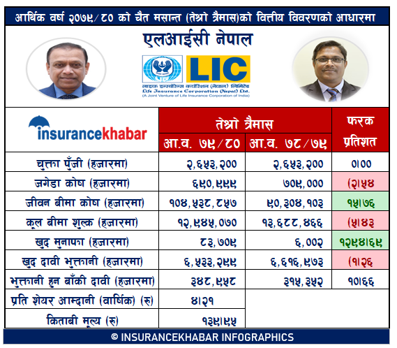 २ अर्ब ६५ करोड चुक्ता पुँजी भएको कम्पनीको जगेडामा ६९ करोड ०९ लाख रहेको छ । एक वर्षको अवधिमा जगेडा रकम २ दशमलव ५४ प्रतिशतले कम भएको छ । जीवन बीमा कोष १५ दशमलव ७६ प्रतिशतले वृद्धि हुँदै १ खर्ब ४ अर्ब पुगेको छ। एक वर्ष अघि जीवन बीमा कोषमा ९० अर्ब ३० करोड थियो ।