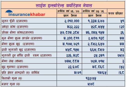 लाईफ इन्स्योरेन्स कर्पोरेशन नेपालले चालु आर्थिक वर्षको प्रथम त्रैमासको वित्तीय प्रतिवेदन सार्वजनिक गरेको छ।