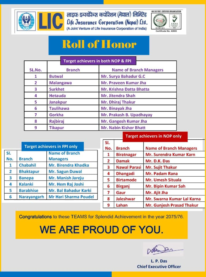 सो कम्पनीले तीन वटा मुख्य विधामा शाखाहरुलाई छनोट गरेको हो । एलआईसी नेपालले गत आर्थिक वर्षमा सबैभन्दा धेरै प्रथम बीमाशुल्क संकलन गर्ने शाखा ६ वटा, धेरै पोलिसी जारी गर्ने शाखा ९ वटा र दुवैमा ९ वटा शाखा गरी २४ वटा शाखा छनोट गरेका हो ।
