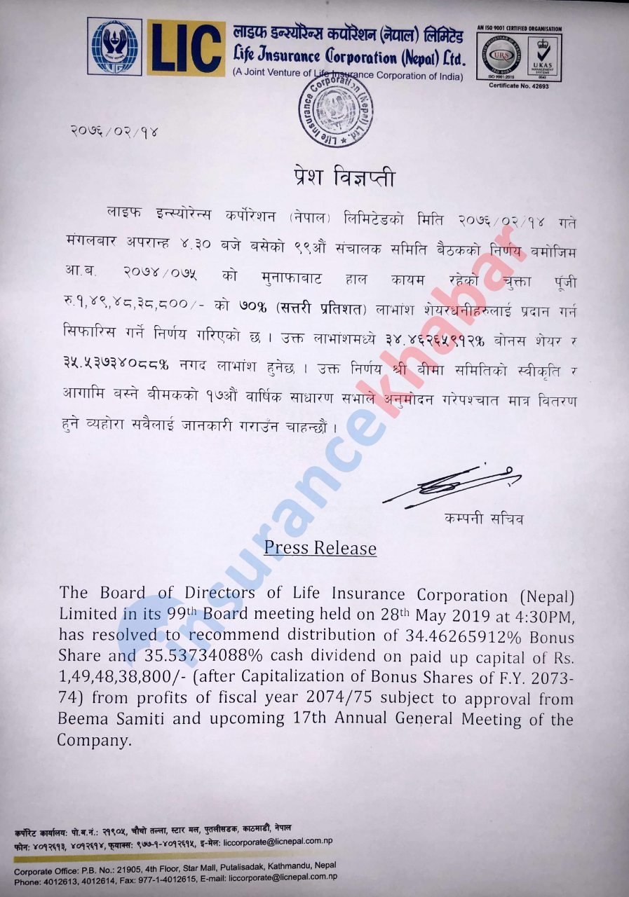 लाइफ इन्स्योरेन्स कर्पोरेशन (नेपाल) लिमिटेडको मिति २०७६/०२/१४ गते मंगलबार अपरान्ह ४.३० बजे बसेको ९९औं संचालक समिति बैठकको निर्णयले आ.ब. २०७४/०७५ को मुनाफाबाट हाल कायम रहेको चुक्ता पुँजी रु.१,४९,४८,३८,८००को ७० प्रतिशत लाभांश शेयरधनीहरुलाई प्रदान गर्न सिफारिस गर्ने निर्णय गरेको छ ।