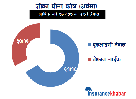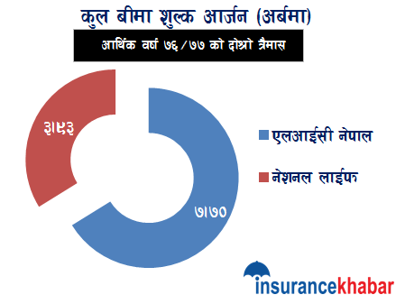 कुल बीमा शुल्क आर्जन : चालु आर्थिक वर्षको दोस्रो त्रैमासमा कम्पनीहरुले प्रकाशन गरेको वित्तीय विवरण अनुसार एलआईसी नेपालले चालु आर्थिक वर्षको दोश्रो त्रैमाससम्ममा ७ अर्ब ६९ करोड रुपैयाँ कुल बीमा शुल्क आर्जन गरेको छ त्यस्तै नेशनल लाइफ इन्स्योरेन्सले ३ अर्ब ९३ करोड रुपैयाँ कुल बीमा शुल्क आर्जन गरेको छ।
