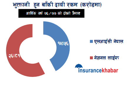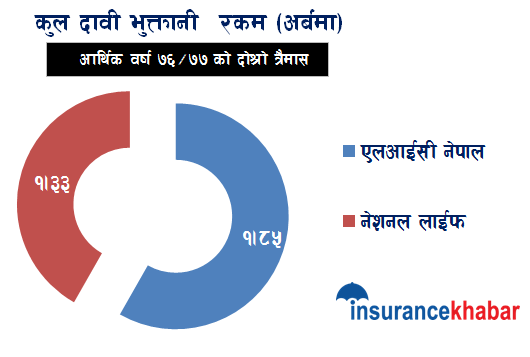 भुक्तानी हुन बाँकी दावी रकमको आधारमा: चालु आर्थिक वर्षको दोस्रो त्रैमासमा कम्पनीहरुले प्रकाशन गरेको वित्तीय विवरण अनुसार एलआईसी नेपालले १९ करोड ५६ लाख रुपैयाँ दावी भुक्तानी गर्न बाँकी छ भने नेशनल लाईफले २६ करोड ८० लाख रुपैयाँ दावी भुक्तानी गर्न बाँकी छ।
