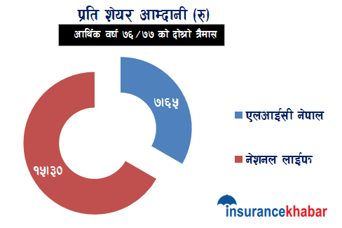 प्रति शेयर आम्दानीको आधारमा : चालु आर्थिक वर्षको दोस्रो त्रैमासमा कम्पनीहरुले प्रकाशन गरेको वित्तीय विवरण अनुसार एलआईसी नेपालको वार्षिक प्रति शेयर आम्दानी ७ रुपैया ६५ पैसा छ भने नेशनल लाइफको वार्षिक प्रति शेयर आम्दानी १५ रुपैया ३० पैसा रहेको छ।