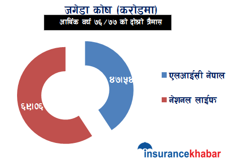 जगेडा कोषको आधारमा : चालु आर्थिक वर्षको दोस्रो त्रैमासमा कम्पनीहरुले प्रकाशन गरेको वित्तीय विवरण अनुसार एलआईसी नेपालको जगेडा कोषमा ४७ करोड ५३ लाख रुपैयाँ संचित छ भने नेशनल लाइफ इन्स्योरेन्सको जगेडा कोषमा ६९ करोड ६ लाख रुपैयाँ संचित छ।