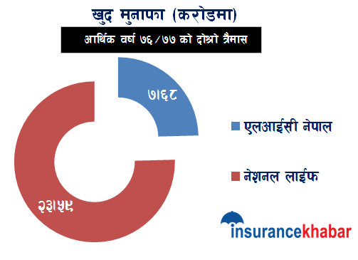 खुद नाफाको आधारमा : चालु आर्थिक वर्षको दोस्रो त्रैमासमा कम्पनीहरुले प्रकाशन गरेको वित्तीय विवरण अनुसार दोश्रो त्रैमाससम्ममा एलआईसी नेपालले ७ करोड ६८ लाख रुपैयाँ खुद मुनाफा गरेकोमा नेशनल लाइफ इन्स्योरेन्सको खुद मुनाफा २३ करोड ५८ लाख रुपैयाँ रहेको छ। यद्यपि, जीवन बीमा कम्पनीहरुको हकमा भने एक्चुअरी मुल्यांकन हुन बाँकी भएकाले खुद नाफा एक्चुअरी मुल्यांकन पश्चात मात्र वास्तविक आउनेछ ।