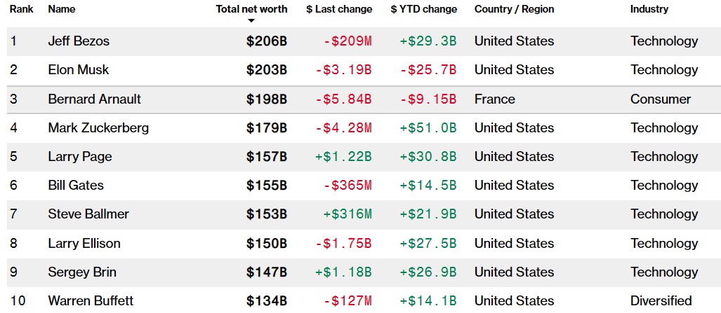 उता अमेजनका संस्थापक जेफ बेजोस मस्कलाई पछि पार्दै विश्वकै धनव्यक्ति बनेका छन्। उनको कुल सम्पत्ति २०६ अर्ब डलर रहेको छ। यद्यपि पछिल्लो २४ घन्टामा उनको सम्पत्ति पनि २०.९ करोड डलरले घटेको छ।