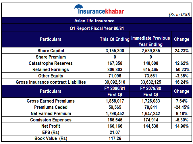 कम्पनीको चुक्ता पुँजी ३ अर्ब १५ करोड रहेको छ । असार मसान्तको तुलनामा कम्पनीको संचित मुनाफा ५० दशमलव २३ प्रतिशतले घट्दै ३० करोड ६३ लाख संचित भएको छ । त्यस्तै अन्य इक्वीटी ७ करोड १० लाख पुगेको छ । जीवन बीमा कोष असार मसान्तको तुलनामा १६ दशमलव २४ प्रतिशतले वृद्धि हुँदै ३९ अर्ब ९ करोड पुगेको छ। असार मसान्तमा जीवन बीमा कोष ३३ अर्ब ६३ करोड थियो ।