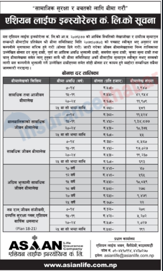 बालबालिकाको सावधिक जीवन बीमालेखको हकमा कम्पनीले न्युनतम ३८ रुपैयाँदेखि ६० रुपैयाँसम्म बोनसदर कामय गरेको छ । १४ वर्ष अवधिसम्मको लागि प्रति हजार ३८ रुपैयाँ,१५ देखि १९ वर्ष अवधिसम्मको लागि ४५ रुपैयाँ, २० देखि २४ वर्ष अवधिसम्मको लागि ५३ रुपैयाँ र २५ वर्ष वा सोभन्दा माथि अवधिका लागि प्रति हजार ६० रुपैयाँसम्म बोनसदर कायम गरेको छ ।