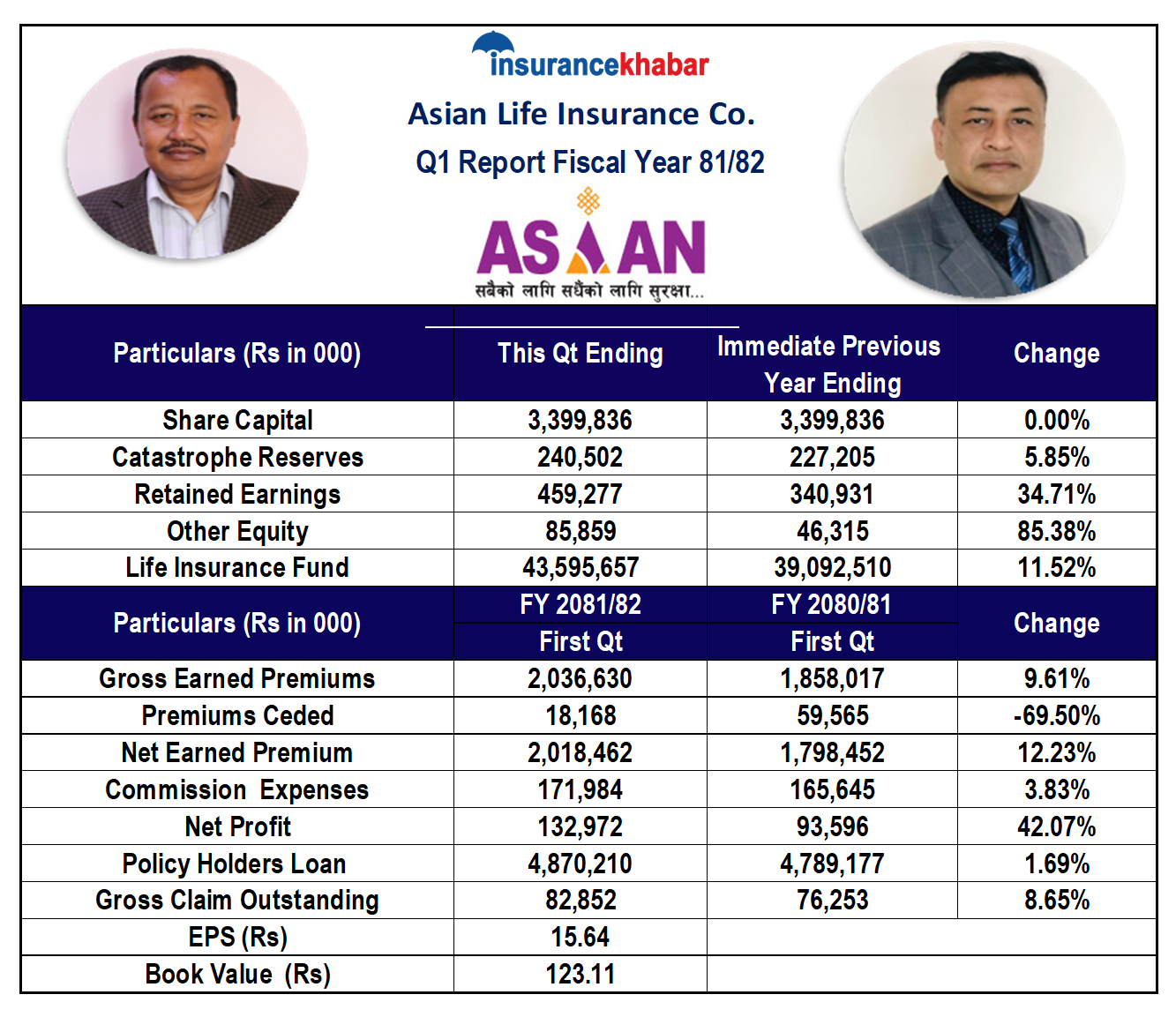 काठमाडौं । एशियन लाइफ इन्स्योरेन्स कम्पनी लिमिटेडले चालू आर्थिक वर्ष २०८१ /८२ को पहिलो त्रैमासको वित्तीय विवरण प्रकाशन गरेको छ । ३ अर्ब ३९ करोड शेयर पूँजी भएको कम्पनीले चालू आर्थिक वर्षको पहिलो त्रैमाससम्ममा १३ करोड २९ लाख रुपैयाँ नाफा आर्जन गरेको छ । गत आर्थिक वर्षको सोही अवधिमा कम्पनीले ९ करोड ३५ लाख रुपैयाँ नाफा आर्जन गरेको थियो । गत आर्थिक वर्षको सोही अवधिको तुलनामा कम्पनीको नाफा ४२.०७ प्रतिशतले वृद्धि भएको हो ।