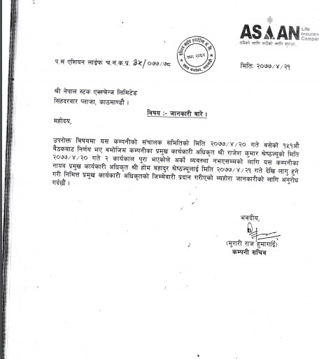 कम्पनीको साउन २० गते बसेको संचालक समितिको बैठककको निर्णय अनुसार कम्पनीको निमित्त प्रमुख कार्यकारी अधिकृतकको जिम्मेवारी दिएको हो ।कम्पनीले एक सूचना जारी गर्दै प्रमुख कार्यकारी अधिकृत राजेश कुमार श्रेष्ठको कार्यकाल पूरा भएकाले अर्को व्यवस्था नभएसम्मको श्रेष्ठलाई जिम्मेवारी दिएको जनाएको छ ।