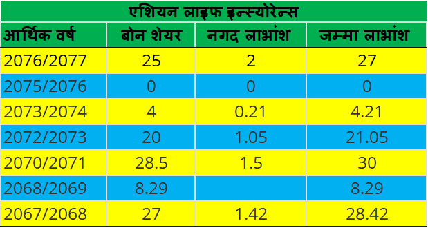 कम्पनीले गत साउन ३१ गते सम्पन्न गर्ने १२ औ साधारणसभामा आर्थिक वर्ष २०७५/७६ को मुनाफाबाट लाभांश दिएको थिएन । यस पटक भने आर्थिक वर्ष २०७४/२०७५, २०७५/२०७६ र २०७६/२०७७ सम्मको सञ्चित मुनाफाबाट एकै पटक २७ प्रतिशत लाभांश दिने घोषणा गरेको हो ।