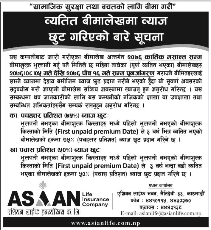 काठमाडौँ । एशियन लाइफ इन्स्योरेन्स कम्पनीले व्यतित बीमालेख नविकरण गर्दा ब्याज छुट दिने भएको छ ।