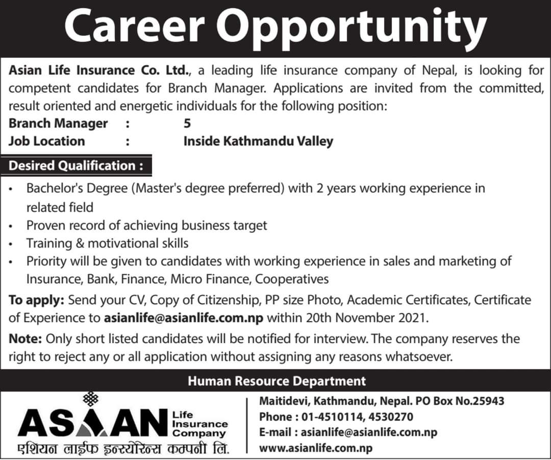 काठमाडौं । एशियन लाइफ इन्स्योरेन्स कम्पनीले कर्मचारीको माग गरेको छ । कम्पनीले ब्रान्च म्यानेजरका लागि ५ जना कर्मचारीको माग गरेको जनाएको छ । कम्पनीले आफ्नो उपत्यकाभित्रका विभिन्न शाखा कार्यालयका लागि कर्मचारीको माग गरेको हो ।