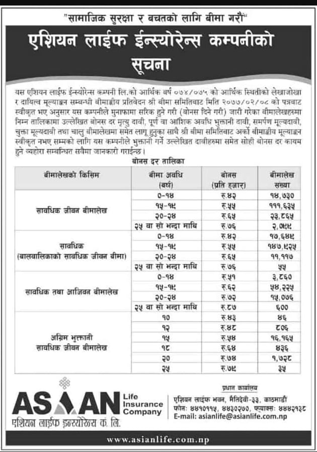 एशियन लाइफले घोषणा गर्यो बीमा क्षेत्रकै उच्च बोनस दर