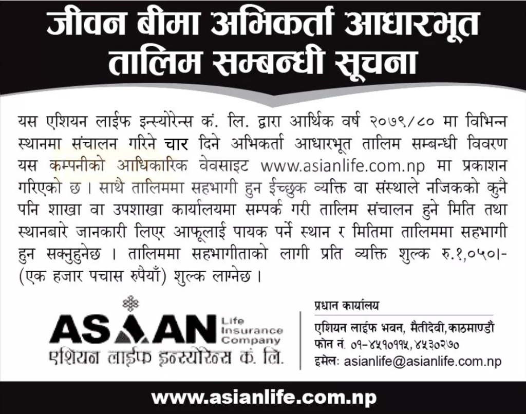 काठमाडौं । एशियन लाइफ इन्स्योरेन्स कम्पनीले जीवन बीमा अभिकर्ता तालिम संचालन गर्ने भएको छ । कम्पनीले आर्थिक वर्ष २०७९/ ८० मा विभिन्न स्थानमा चार दिने आधारभुत तालिम संचालन गर्ने जनाएको छ । उक्त तालिम सम्बन्धी सुचना कम्पनीले आफ्नो वेवसाइटमा प्रकाशन गरेकाे छ । ईच्छुकहरुले नजिककाे पायक पर्ने शाखा कार्यालयमा गइ सम्पर्क गरी प्रवेशिका परिक्षा उतीर्ण प्रमाण पत्र,चारित्रिक प्रमाण पत्र, नेपाली नागरिकताकाे प्रमाण पत्र सहित आवेदश पेश गरेर तालिममा सहभागी हुन सक्नेछन् । तालिममा सहभागीता र अभिकर्ता इजाजत पत्रकाे लागि १ हजार ५० रुपैयाँ शुल्क लाग्नेछ ।