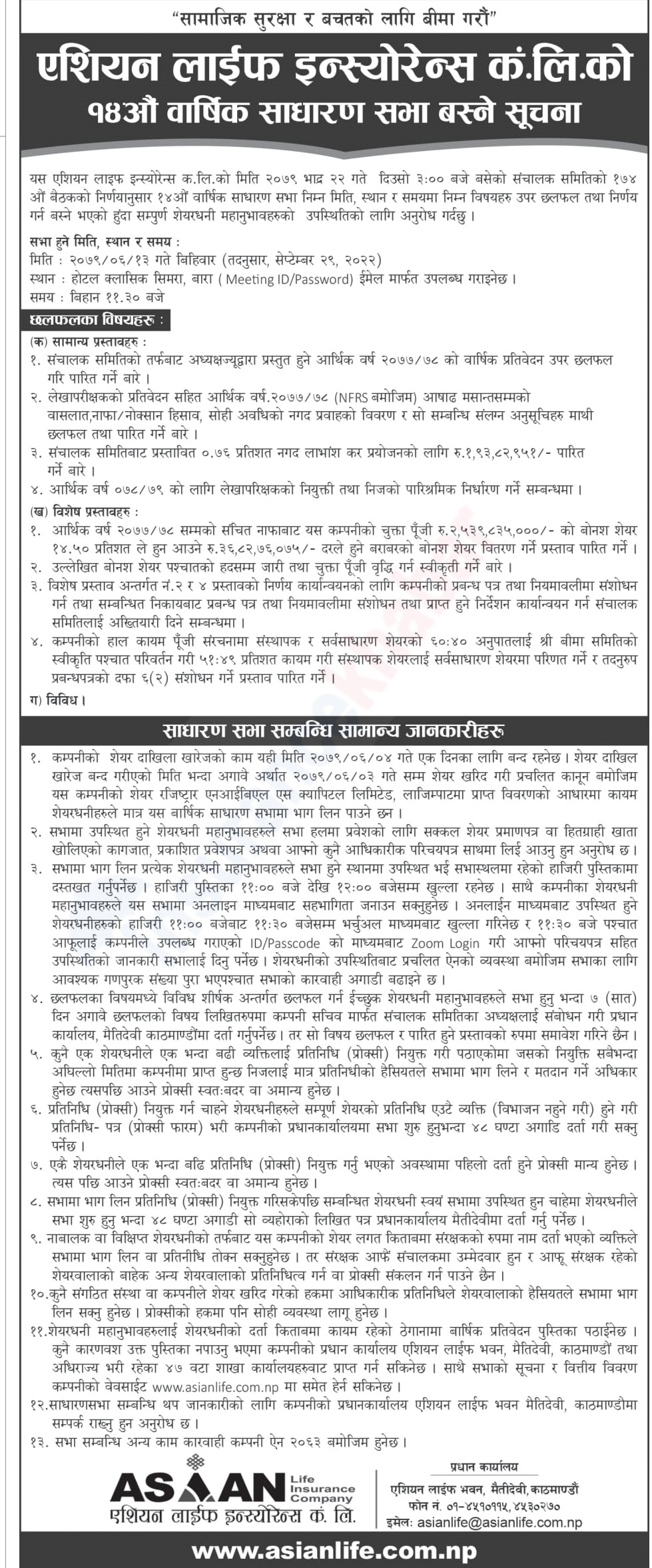 एशियन लाइफले बोलायो साधारणसभा, कहिलेसम्मका शेयरधनीले पाउने छन् लाभांश? (नोटिस सहित)