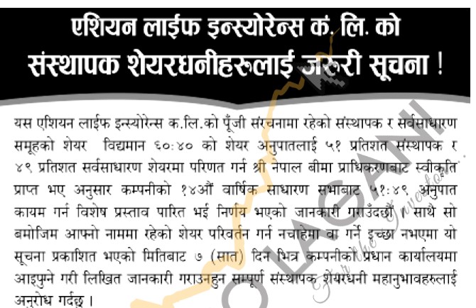 शेयर स्वामित्व परिमार्जनसम्बन्धी विशेष प्रस्ताव कम्पनीको १४औँ वार्षिक साधारणसभा मार्फत पारित भइसकेको जनाएको छ । साथै, नेपाल बीमा प्राधिकरणले पनि स्वीकृति दिइसकेको छ । संस्थापक शेयर सर्वसाधारण शेयरमा परिवर्तन गर्न ईच्छुक नभएका शेयरधनीहरुलाई कम्पनीले ७ दिन भित्र लिखित जानकारी गराउन आग्रह गरेको छ।