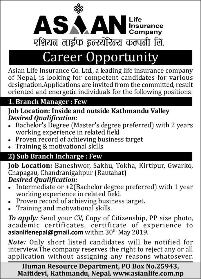 एशियन लाइफ इन्स्योरेन्स कम्पनीले विभिन्न पदका लागि कर्मचारी माग गरको छ । कम्पनीले ब्राञ्ज म्यानेजर पदमा केही, सब ब्राञ्ज इन्जार्ज पदमा केही कर्मचारी माग गरेको हो ।