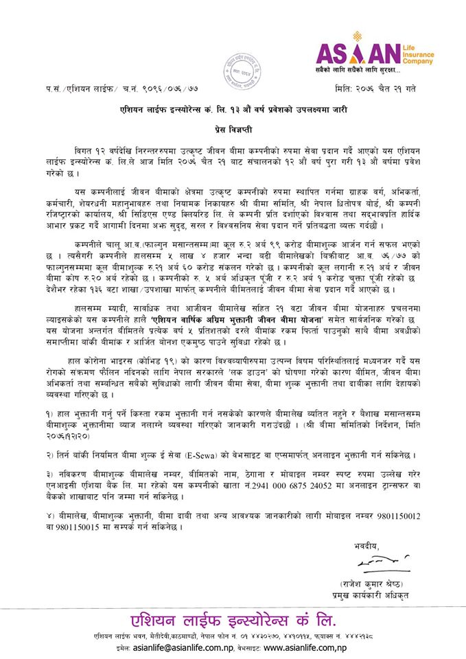 काठमाडौं । एशियन लाइफ इन्स्योरेन्स कम्पनीले नयाँ जीवन बीमा योजना सार्वजनिक गरेको छ । कम्पनीले १२ औं वर्ष पुरा गरी १३ औं वर्षमा प्रवेश गरेको अवसरमा एशियन वार्षिक भुक्तानी जीवन बीमा योजना संचालनमा ल्याएको हो ।