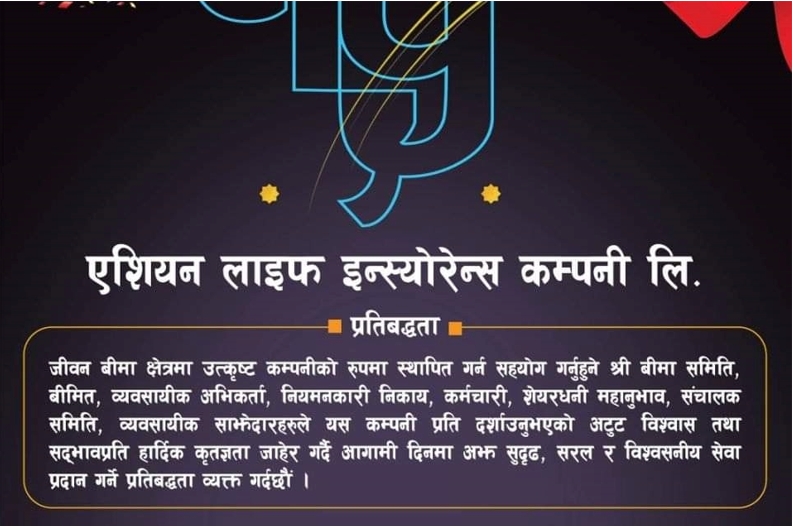 काठमाडौं । एशियन लाइफ इन्स्योरेन्स कम्पनी १४ वर्ष पुरा गरी १५ औं वर्षमा प्रवेश गरेको छ । कम्पनीले २०६४ फागुन १५ गते जीवन बीमा व्यवसायको लागि लाइसेन्स पाएको थियो । जीवन बीमा व्यवसायको लागि अनुमति पाए सँगै कम्पनीले २०६४ चैत २१ गतेदेखि जीवन बीमा व्यवसायको शुभारम्भ गरेको थियो । कम्पनीले १४ वर्षको अवधिमा जीवन बीमा कोषमा ३० अर्ब २४ करोड रुपैयाँ जम्मा गर्न सफल भएको छ ।