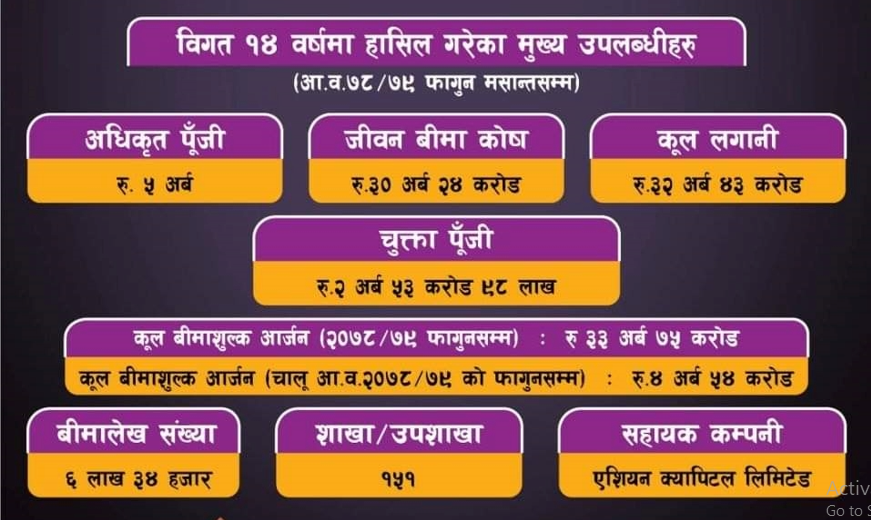 फागुन मसान्तसम्ममा कम्पनीले विभिन्न क्षेत्रमा ३२ अर्ब ४३ करोड रुपैयाँ लगानी गर्न सफल भएको छ । यस अवधिमा कम्पनीले बीमित सँग ३३ अर्ब ७५ करोड रुपैयाँ बीमा शुल्क संकलन गरिसकेको छ । यस आर्थिक वर्षको फागुन मसान्तसम्ममा मात्रै ४ अर्ब ५४ करोड रुपैयाँ संकलन गरिसकेको छ ।