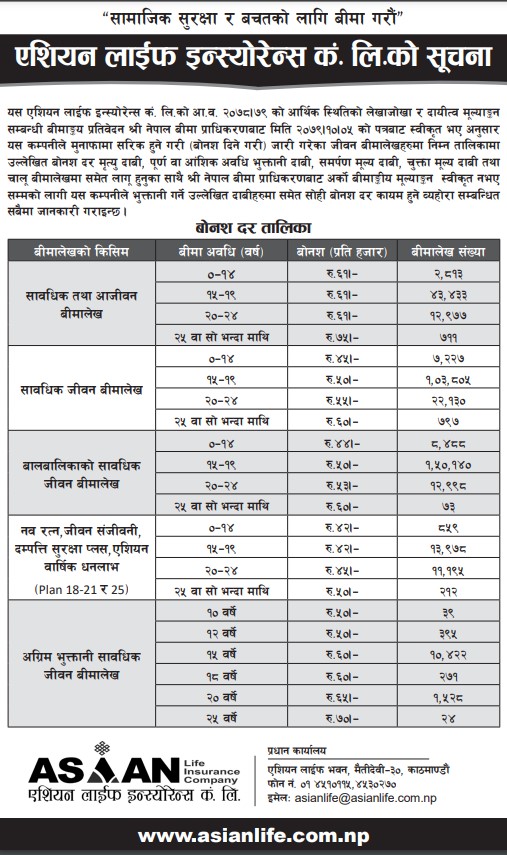 काठमाण्डाै‌। एशियन लाईफ इन्स्याेरेन्सले पनि गत आर्थिक वर्ष २०७८।७९ काे बीमालेख बाेनश दर सार्वजनिक गरेकाे छ । नेपाल बीमा प्राधिकरणबाट आव २०७८।७९ काे बीमा‌ंकी मूल्यांकन प्रतिवेदन स्वीकृत भएपछि कम्पनीले स्वीकृत बाेनश दर सार्वजनिक गरेकाे हाे । कम्पनीले अघिल्लाे आर्थिक वर्ष २०७७।७८ काे तुलनामा गत आव २०७८।७९ मा बाेनश दरमा सुधार गर्न सफलता पाएकाे छ ।