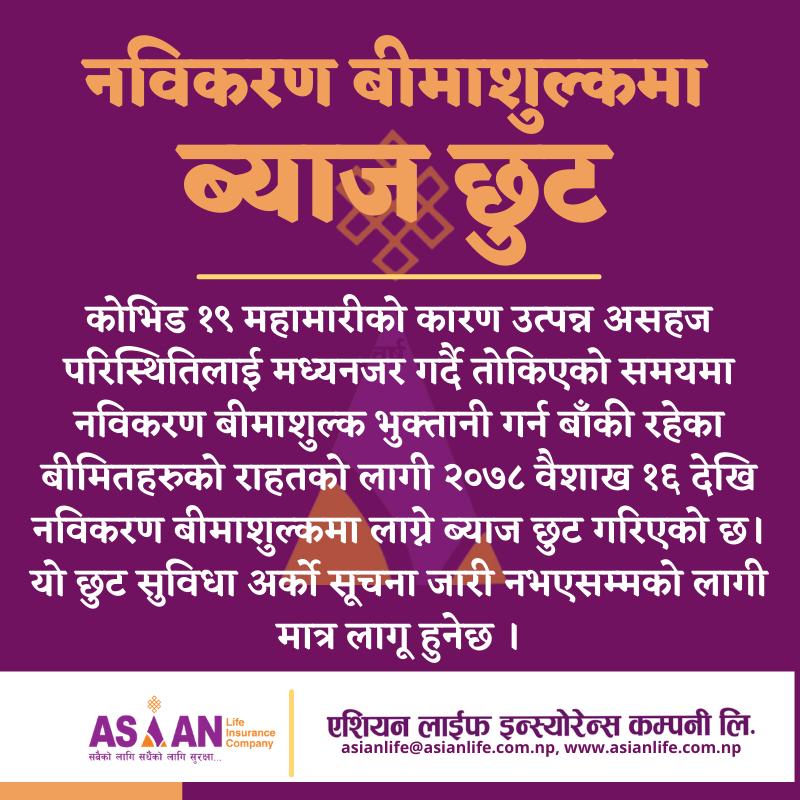 काठमाण्डौं । एशियन लाईफ इन्स्योरेन्स कं. लि.ले नविकरण बीमा शुल्कमा लाग्ने ब्याजमा शत प्रतिशत छुटको घोषणा गरेको छ । काठमाण्डौं उपत्यकामा निषेधाज्ञा लागू गरिएको मिति बैशाख १६ गतेदेखि लागू हुने गरी अर्को सूचना जारी नभएसम्मको अवधिको लागी आफ्नो बीमितहरुलाई नविकरण बीमाशुल्कमा लाग्ने ब्याजमा छुटको घोषणा गरेको हो । कम्पनीका अनुसार तोकिएको समयमै नविकरण बीमाशुल्क भुक्तानी गर्न नसकेका बीमितहरुलाई वैशाख १६ गतेदेखि ब्याज लाग्नेछैन ।