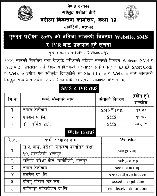 राष्ट्रिय परीक्षा बोर्डले माध्यमिक शिक्षा परीक्षा (एसईई)को नतिजा सार्वजनिक गरेको जनाएको छ । सोमबार बसेको बोर्ड बैठकले नतिजा सार्वजनिक गर्ने निर्णय गरेको बोर्डका अध्यक्ष प्रा.डा. चन्द्रमणि पौडेलले जानकारी दिए । नतिजा नेपाल टेलिकमको वेभसाईट र परिक्षा बोर्डकै वेभसाईटमा हेर्न सकिने छ ।