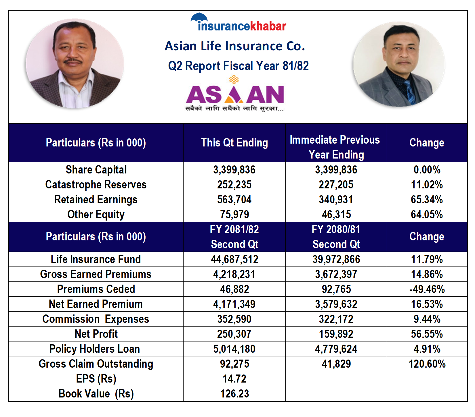 काठमाडौं । एसियन लाइफ इन्स्योरेन्स कम्पनीले चालु आर्थिक वर्षको दोस्रो त्रैमास (साउन–पुस)सम्मको अपरिष्कृत वित्तीय विवरण सार्वजनिक गरेको छ।