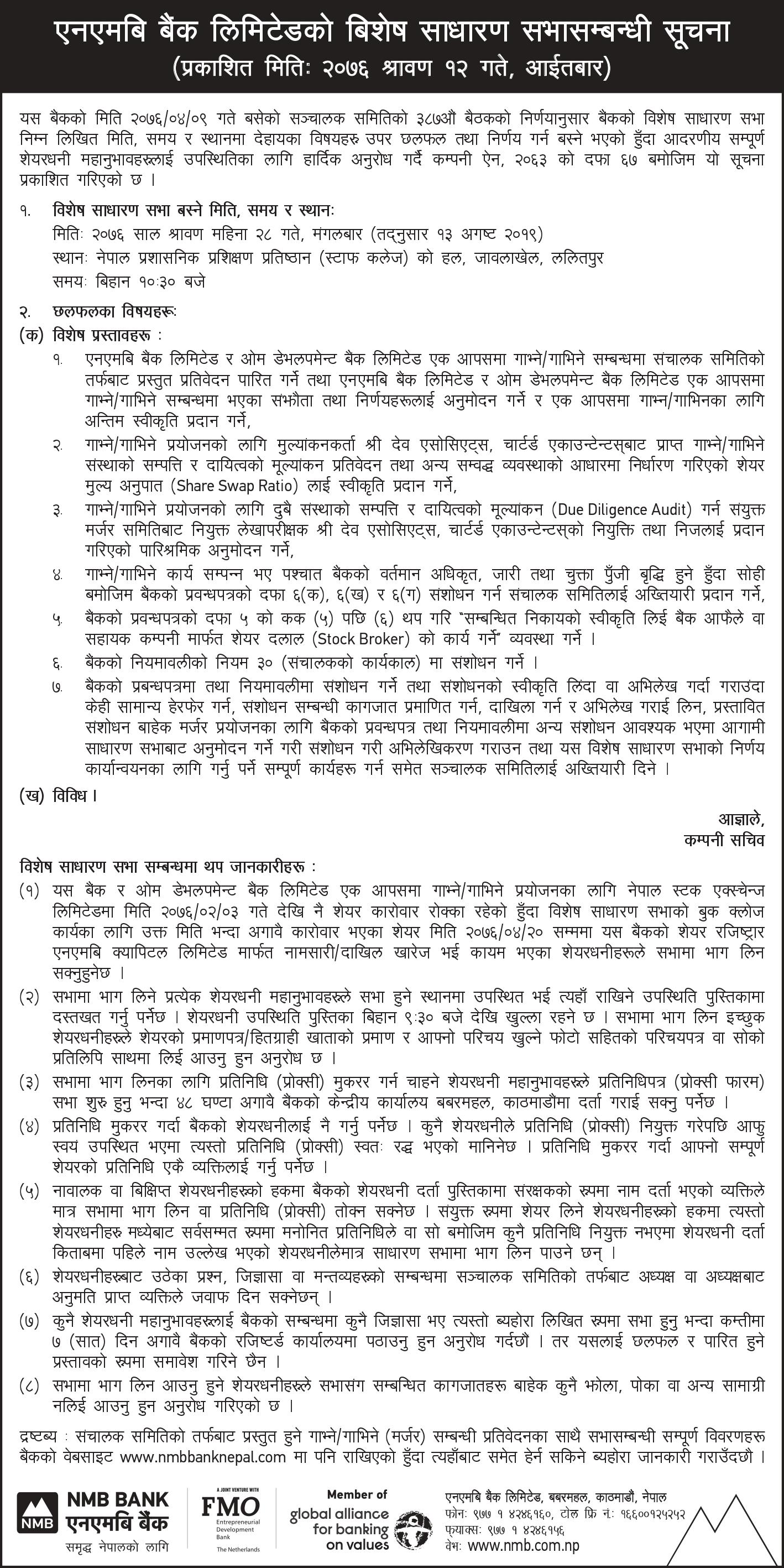 त्यस्तै, ओम डेभलपमेन्ट बैंकले भने भोली सोमबार (साउन २७ मा) विशेष साधारण सभा बोलाएको छ ।