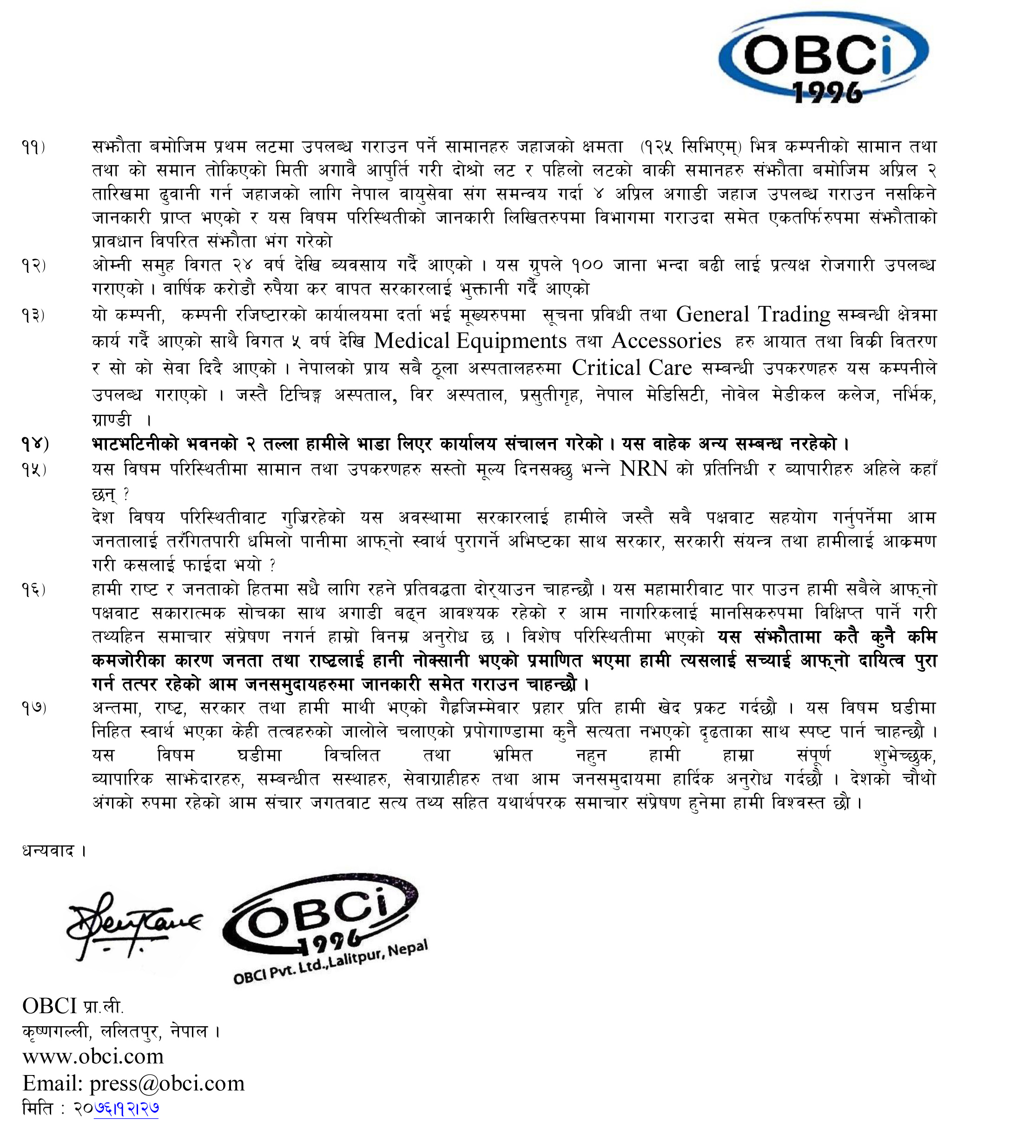 महाविपत्तिको समयमा भ्रष्टाचार भयो भन्दै चर्को विरोध गर्नेहरु आज कहाँ छन् ? बक्तव्यमा विरोध गर्नेहरुलाई प्रश्न गरिएको छ । ओबिसिआईद्वारा जारी बिज्ञप्तिमा ओम्नी ग्रुपले पटक पटक स्वास्थ्य सेवा विभागसँग सम्पर्क गर्न खोज्दा सम्पर्क हुन नसकेको समेत जनाएको छ । साथै ओम्नी ग्रुपले आफूले आपूर्ति गरेको कुनै पनि सामानको गुणस्तर न्यून भए त्यसको जिम्मेवारी लिन तयार समेत समेत जनाइएको छ ।