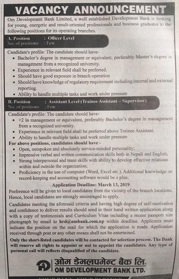 ओम डेभलपमेन्ट बैंकले विभिन्न पदका लागि कर्मचारीको माग गरेको छ । बैंकले अफिसर र असिस्टेन्ट पदका लागि केही संख्यामा कर्मचारीको माग गरेको हो ।