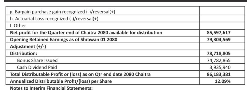संस्थाको वितरणयोग्य नाफा ८ करोड ६१ लाख रुपैयाँ रहेको छ भने हाल कायम शेयर संख्याले भाग गर्दा संस्थाको वार्षिक प्रतिशेयर वितरणयोग्य नाफा १२.०९ रुपैयाँ देखिन्छ।