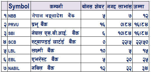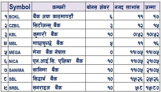 २७ वाणिज्य बैंकमध्ये ९ वाणिज्य बैंकले आर्थिक वर्ष ७५/७६ को साधारण सभा र लाभांश प्रयोजनाका लागि बुक क्लोज गरिसकेको अवस्था छ। बैंक अफ काठमान्डौ, सिटिजन्स बैंक, कुमारी बैंक, माछापुछ्रे बैंक, मेगा बैंक, एनआईसी एसिया, सानिमा बैंक, सिद्धार्थ बैंक र सनराईज बैंकले साधरण सभा प्रयोजन लागि बुक क्लोज गरिसकेको अवस्था छ। अब दोश्रो बजारमा यी कम्पनीको शेयर किन्नेले आर्थिक वर्ष ७५/७६ को लाभांश प्राप्त गर्ने छैनन्।