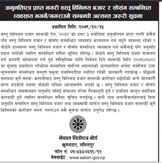 बोर्डले वस्तु विनिमय बजार संचालन गर्न कम्पनी संस्थापना गर्न पूँर्व स्वीकृतिका लागि निवेदन दिन पेश गर्न २०७९ असोज २ गते सूचना जारी गरेको थियो । तर सर्वोच्च अदालतले अल्पकालिन आदेश बमोजिम उक्त सूचना सँग सम्बन्धित सम्पुर्ण प्रकृयाँ स्थगित गर्न निर्देशन दिएको थियो । त्यस पछि बोर्डले धितोपत्र बजार सम्बन्धित कुनै पनि प्रकृयाँ अगाडी बढाउन पाएको छैन ।