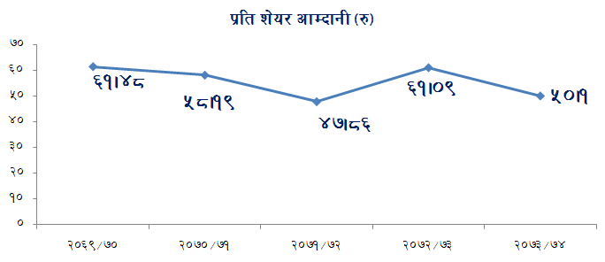 खुद नाफा ८ प्रतिशतले वृद्धि हुनु र पुँजी २५ प्रतिशतले वृद्धि भएकाले कम्पनीको प्रति शेयर आम्दानी भने १४ प्रतिशतले घटेको छ । हाल कम्पनीको वार्षिकरण गरिएको प्रति शेयर आम्दानी २६ रुपैयाँ ३९ पैसा रहेको छ ।