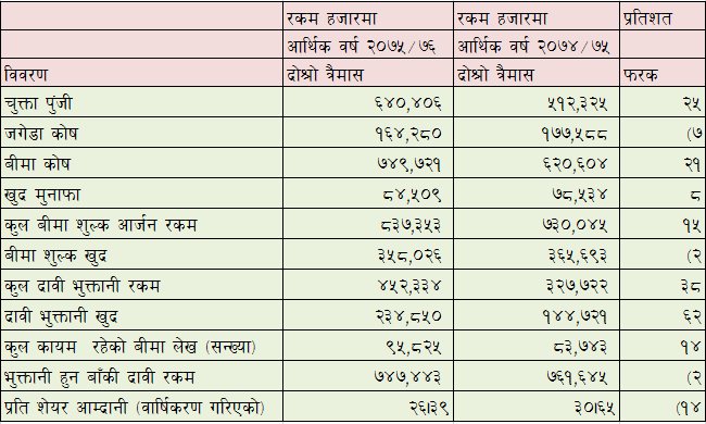 इन्स्योरेन्सले सार्वजनिक गरेको चालु आर्थिक वर्षको दोश्रो त्रैमासिक वित्तीय विवरण अनुसार आर्थिक वर्ष २०७५/७६ र २०७४/७५ बीच तुलना गर्दा :