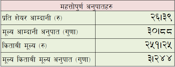 - कम्पनीको दोश्रा त्रैमासमा प्रतिशेयर नेटवर्थ २ सय ५१ दशमलव २५ रुपैयाँ, प्रति शेयर कुल सम्पत्तीको मुल्य ४ सय ५१ रुपैयाँ रहेको छ ।