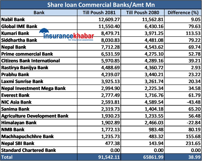 नेपाल राष्ट्र बैंकले सार्वजनिक गरेको तथ्यांकअनुसार हाल सञ्चालनमा रहेका २० वटामध्ये १९ वटा वाणिज्य बैंकले पुससम्म ९१ अर्ब ५४ करोड २१ लाख रुपैयाँ शेयर लोन प्रवाह गरेका हुन्। अघिल्लो वर्ष यही अवधिसम्म बैंकहरुले ६५ अर्ब ८६ करोड १९ लाख रुपैयाँ शेयर लोन प्रवाह गरेका थिए। अघिल्लो वर्षको तुलनामा शेयर लोन ३८.९९ प्रतिशतले बढेको छ।