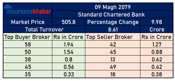 काठमाडौं । साताको पहिलो कारोवार माघ ९ गतेका दिन स्ट्याण्डर्ड चार्टर्ड बैंक नेपालको शेयर मूल्यमा माथिल्लो सर्किट लागेको छ । कम्पनीले सार्वजनिक गरेको दोश्रो त्रैमासको वित्तीय प्रतिवेदनलाई हेरेर आज लगानीकर्ताहरु आकर्षित भएका हुन् ।